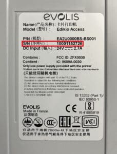 *A partir du numéro de série 10001152726. Pour trouver votre numéro de série : rendez-vous sous votre Access ! Vous y trouverez une étiquette et l’indication S/N qui correspond au numéro de série de votre imprimante :