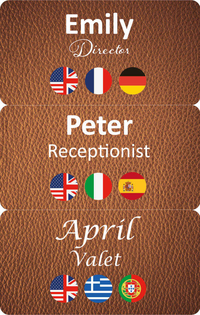 Aiutate i vostri clienti a identificare facilmente il vostro personale indicando tutte le informazioni di cui hanno bisogno sui badge dei dipendenti: logo, nome, mansione e lingua/e parlata/e.