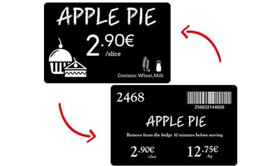 Abitudini alimentari (kosher, halal, vegano, ecc.) Restrizioni dietetiche (senza glutine, senza latte, senza zucchero, ecc.) Etichettatura specifica (locale, biologica, artigianale, ecc.) Visualizzare più prezzi sulla stessa etichetta: Prezzo unitario e prezzo al chilo, al litro, ecc. Prezzo di vendita promozionale