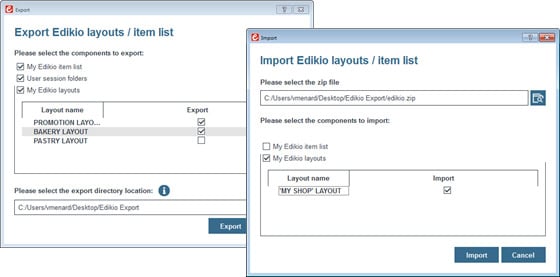 È possibile esportare l’elenco degli articoli o i modelli di etichetta creati sul software Edikio per utilizzarli su altri computer dotati di Edikio. Salvate l’intera sessione di Edikio. Consente di esportare elenchi di articoli e/o modelli in formato “.zip” e di importarli su altri computer. Ideale per i rivenditori, che possono creare modelli di etichette e categorie una sola volta per tutti i punti vendita.