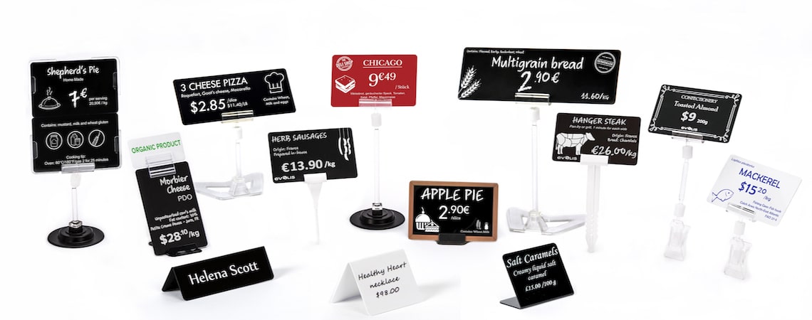 È possibile adattare facilmente i cartellini dei prezzi e gli espositori del punto vendita per creare l’aspetto e l’atmosfera del proprio negozio.È il complemento perfetto per i vostri prodotti, per catturare l’attenzione degli acquirenti. In caso di dubbio, ricordate che il classico design del cartellino dei prezzi bianco su nero è una scelta affidabile per i negozi che vogliono trasmettere un’atmosfera elegante e lussuosa.