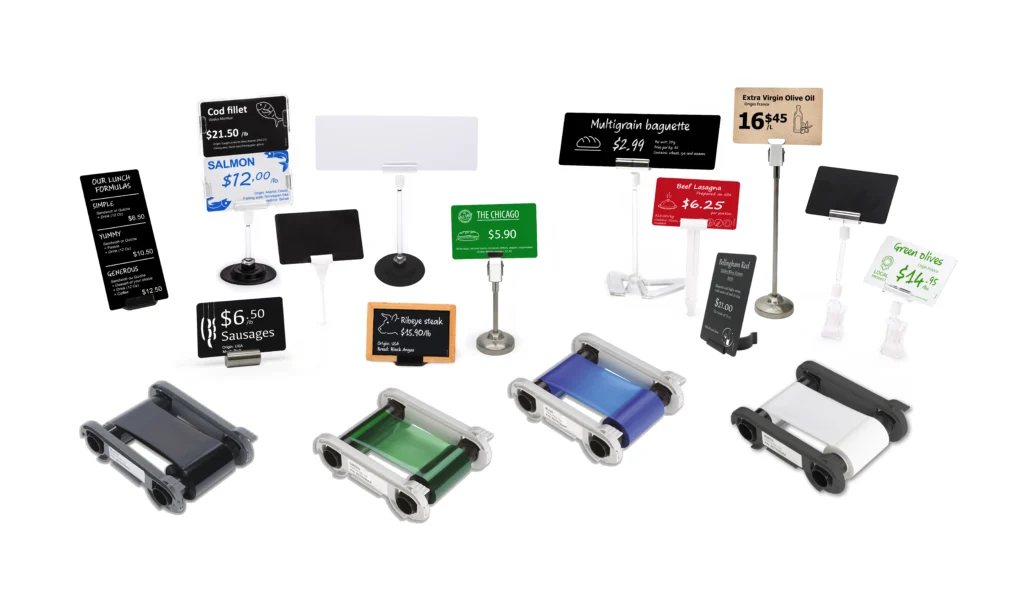Numerose combinazioni di etichette prezzo sono possibili grazie alla nostra gamma completa di cartoncini e nastri