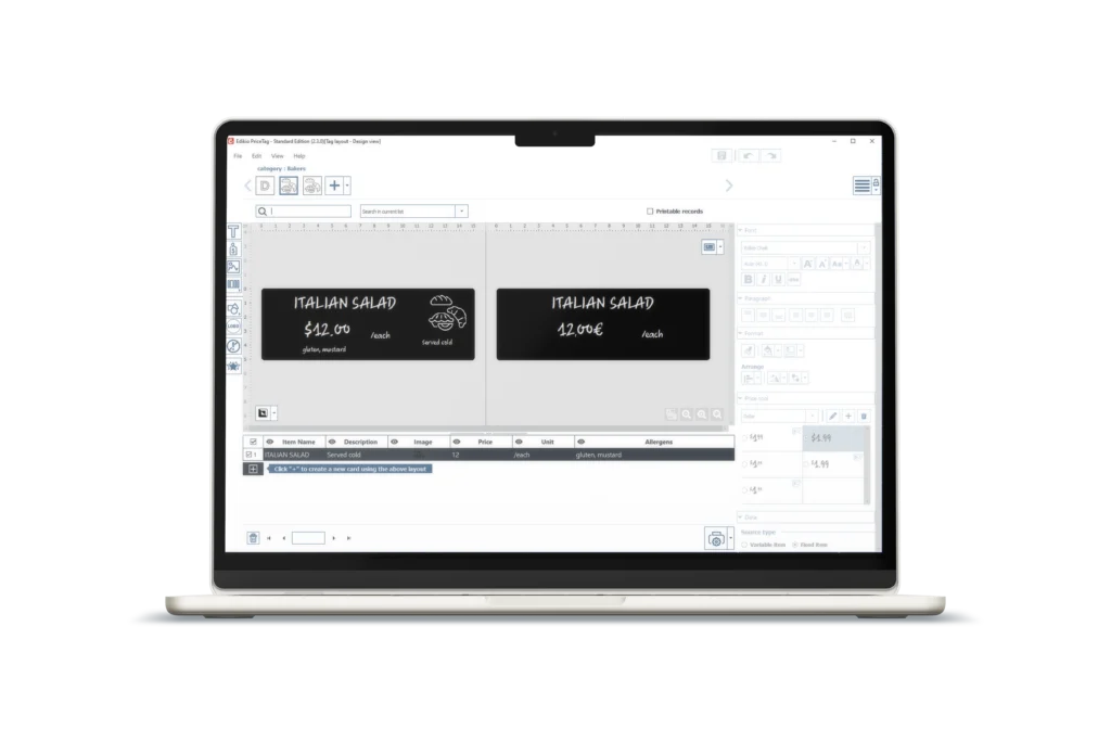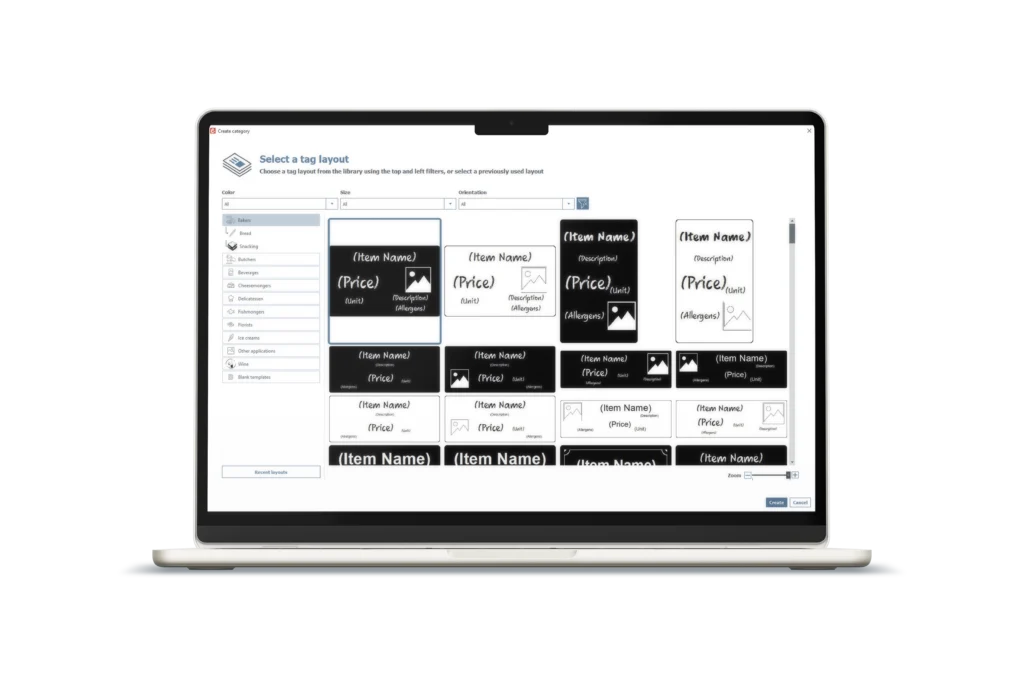Il formato lungo è ideale per visualizzare più informazioni, utilizzare caratteri più grandi o rispettare specifici obblighi normativi in settori come panetterie, macellerie, supermercati e molto altro (link alle pagine di settore).